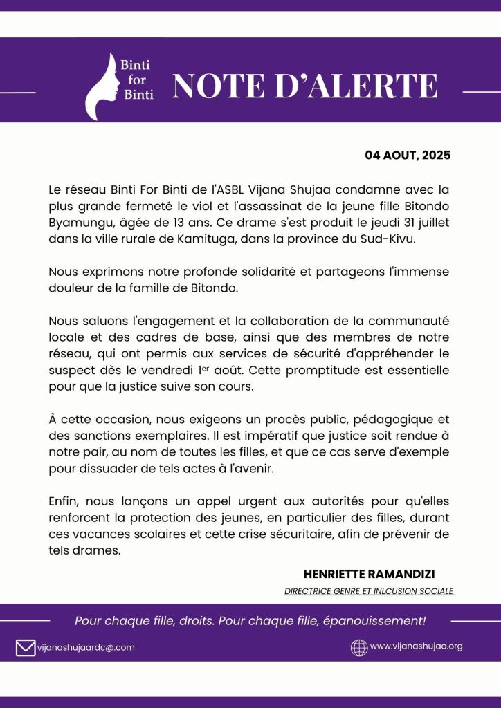 À travers cette note d’alerte, le réseau Binti For Binti condamne avec la plus grande fermeté le viol et l’assassinat de la jeune fille Bitondo Byamungu, âgée de 13 ans, salue l’arrestation du suspect et demande un procès public, pédagogique et des sanctions exemplaires afin que justice soit rendue àsa Bitondo, au nom de toutes les filles, et que ce cas serve d’exemple pour dissuader de tels actes à l’avenir.