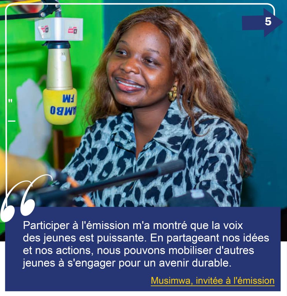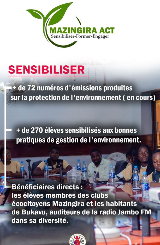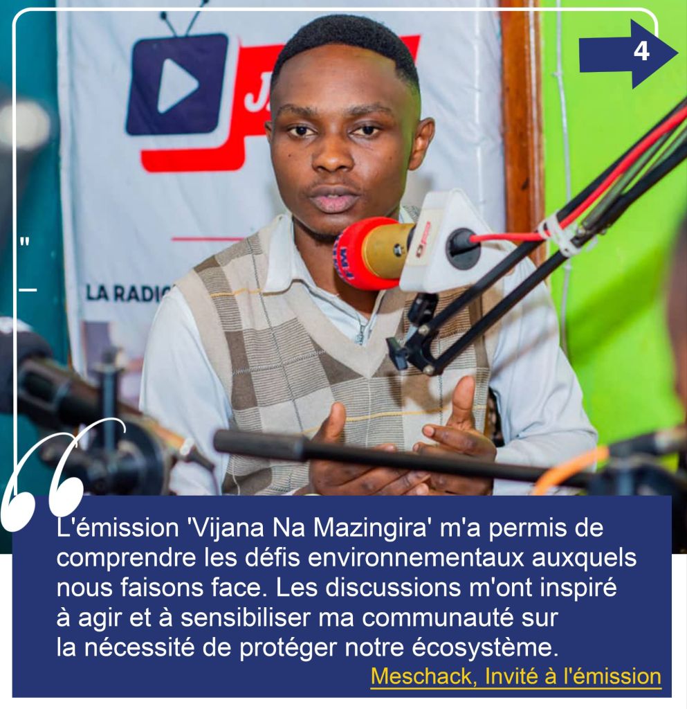 Parmi les trois piliers d’action de notre programme annuel Mazingira Act, l’un d’eux est « Sensibiliser ». Pour nous, ce n’est pas une simple campagne de messages, mais un travail patient de prise de conscience qui vise à ouvrir les yeux des jeunes et des communautés sur les enjeux environnementaux qui touchent leur quotidien. À travers nos émissions, nos activités parascolaires et nos actions de terrain, nous voulons semer des idées qui transforment les mentalités et inspirent le passage à l’action. Et eux, comment vivent-ils cette sensibilisation au jour le jour?
